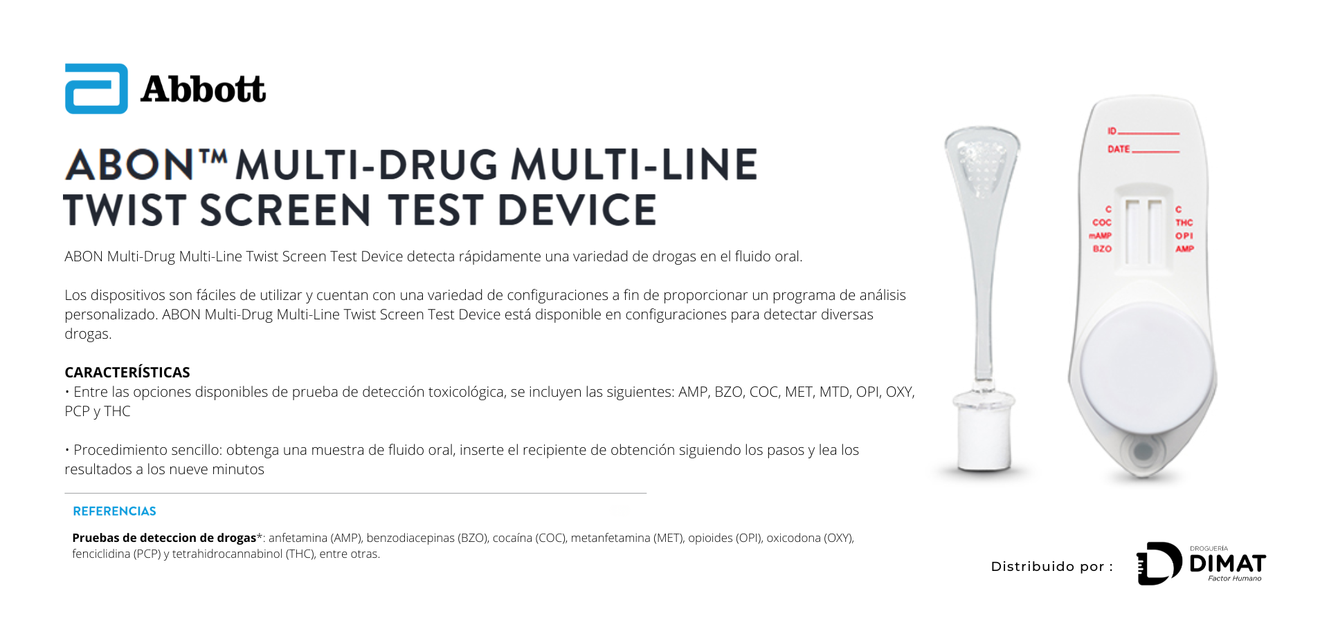 ABON™ Multi-Drug Multi-Line Twist Screen Test Device es un dispositivo de diagnóstico rápido, tipo cassette, para la detección simultánea de múltiples drogas en saliva. Su uso está destinado a profesionales de la salud o responsables de seguridad e higiene entrenados.