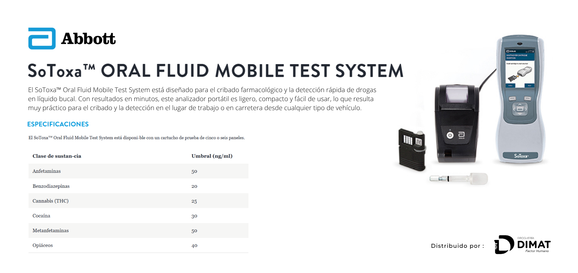 SoToxa™ Oral Fluid Mobile Test System es un sistema portátil desarrollado por Abbott para la detección cualitativa de múltiples drogas en saliva. Su diseño compacto, digital y fácil de usar lo convierte en una herramienta ideal para satisfacer las exigencias de entornos laborales de alto rendimiento, especialmente en sectores industriales de alto riesgo.